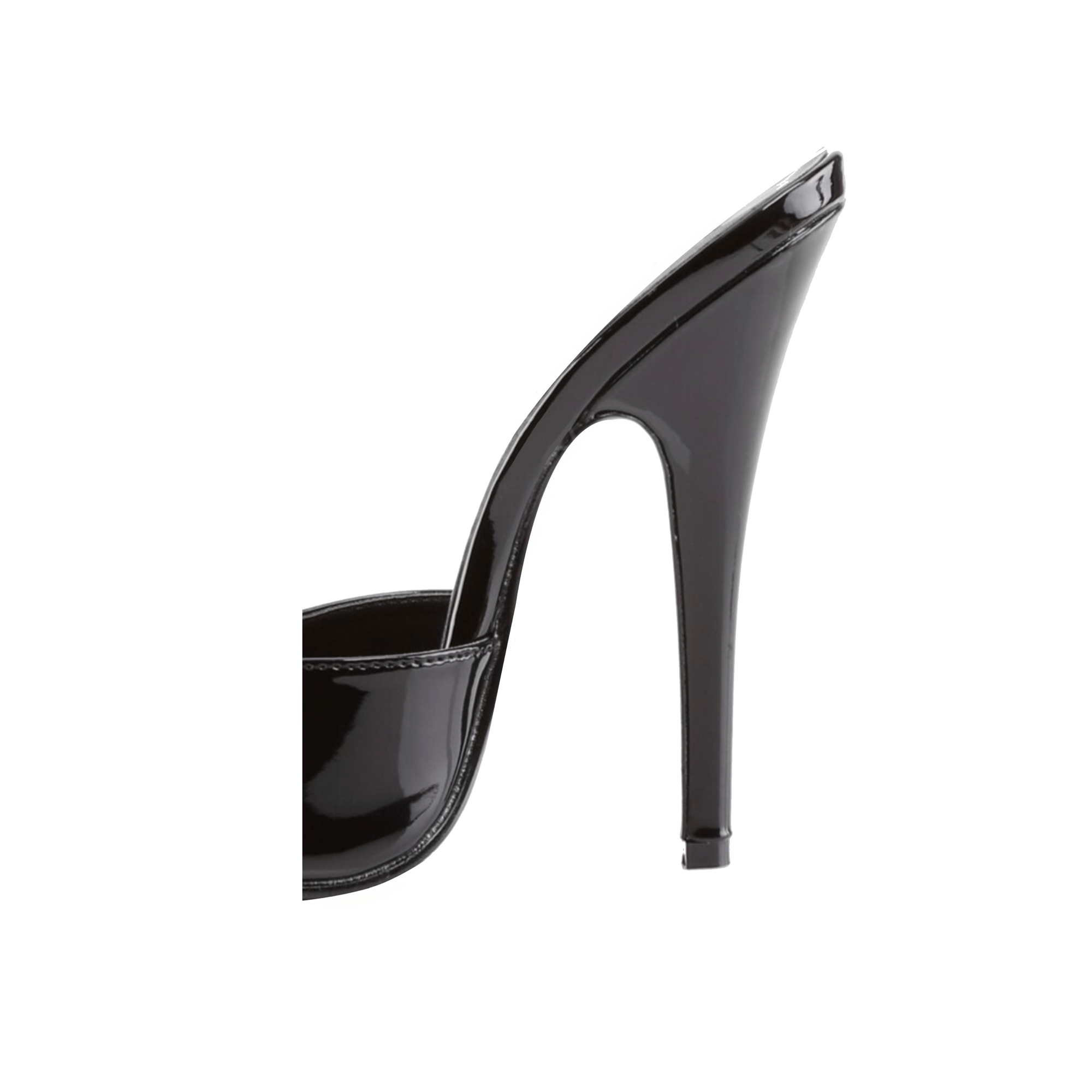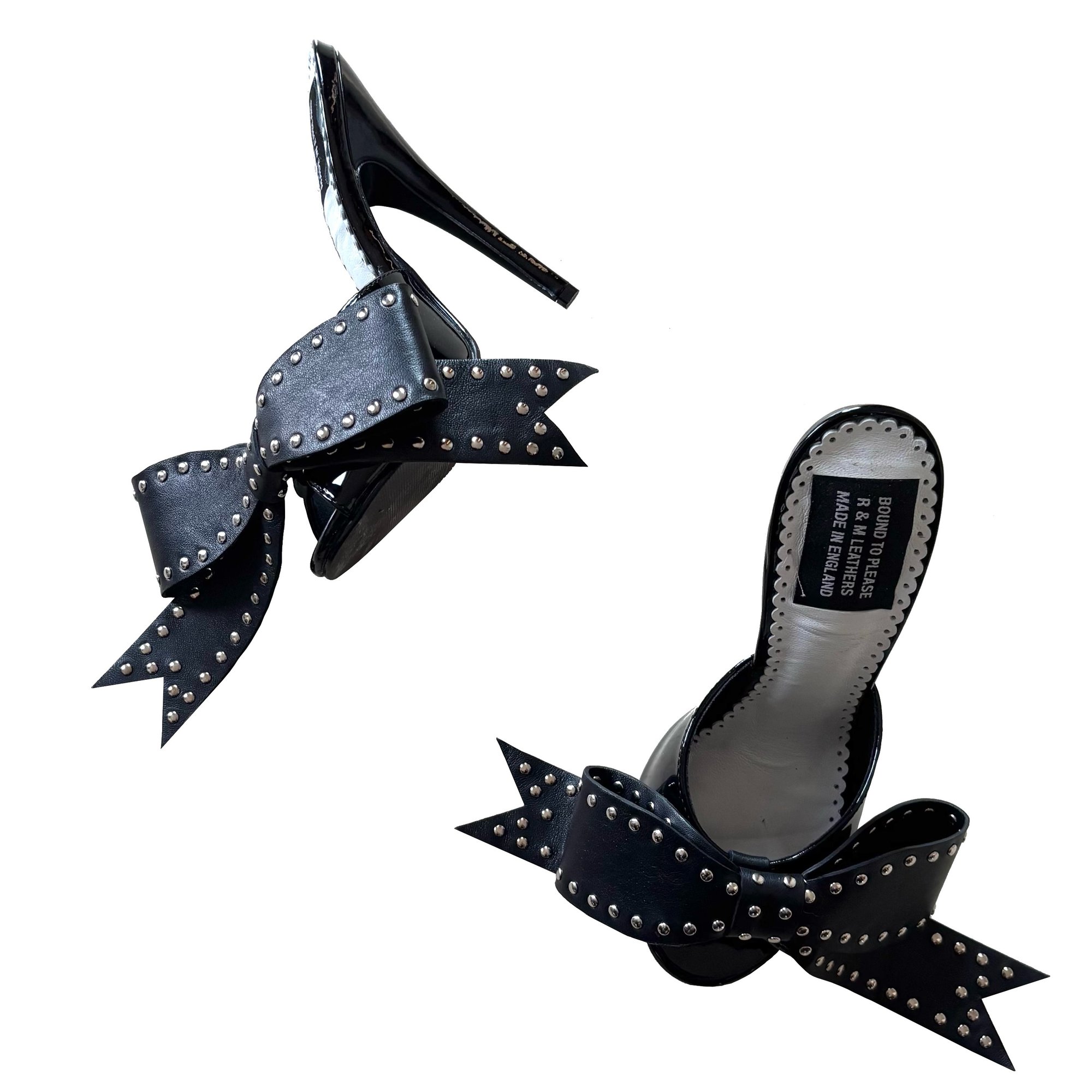 Patent fetish mules with handmade studded bow. Available in two heel heights: 4 or 6 inch.