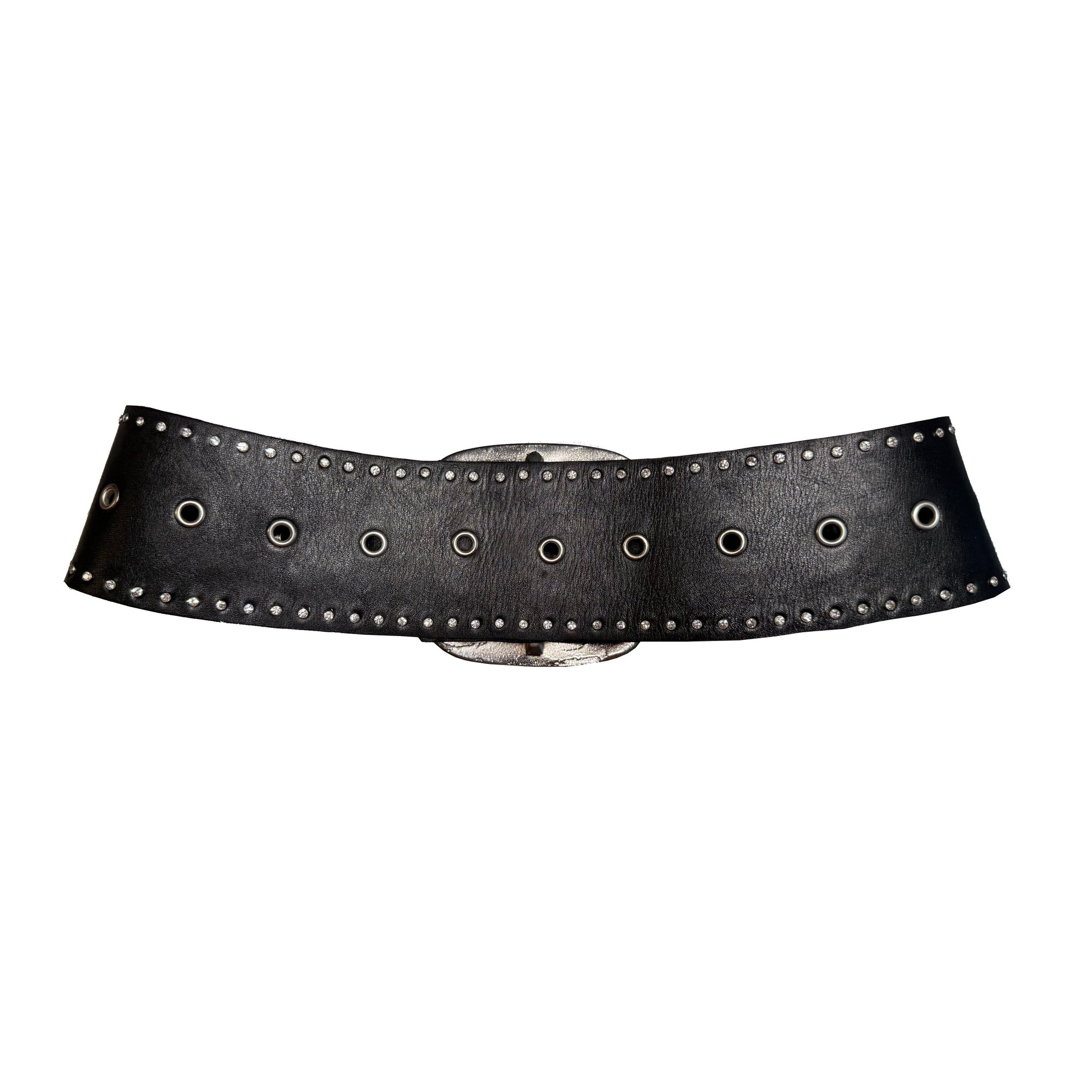 Thick mid rise leather belt sample with crystal studded edge detail. Size XXS-XS. 82cm