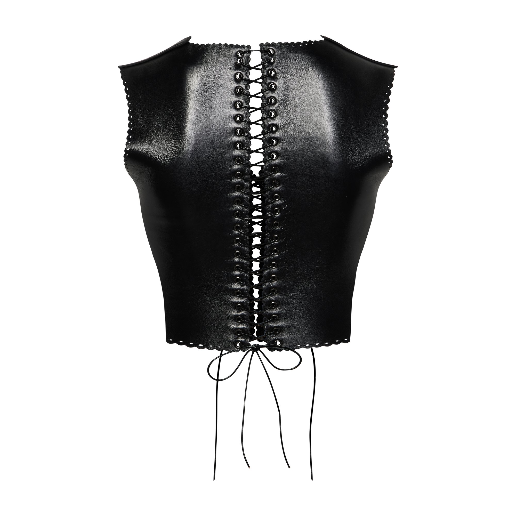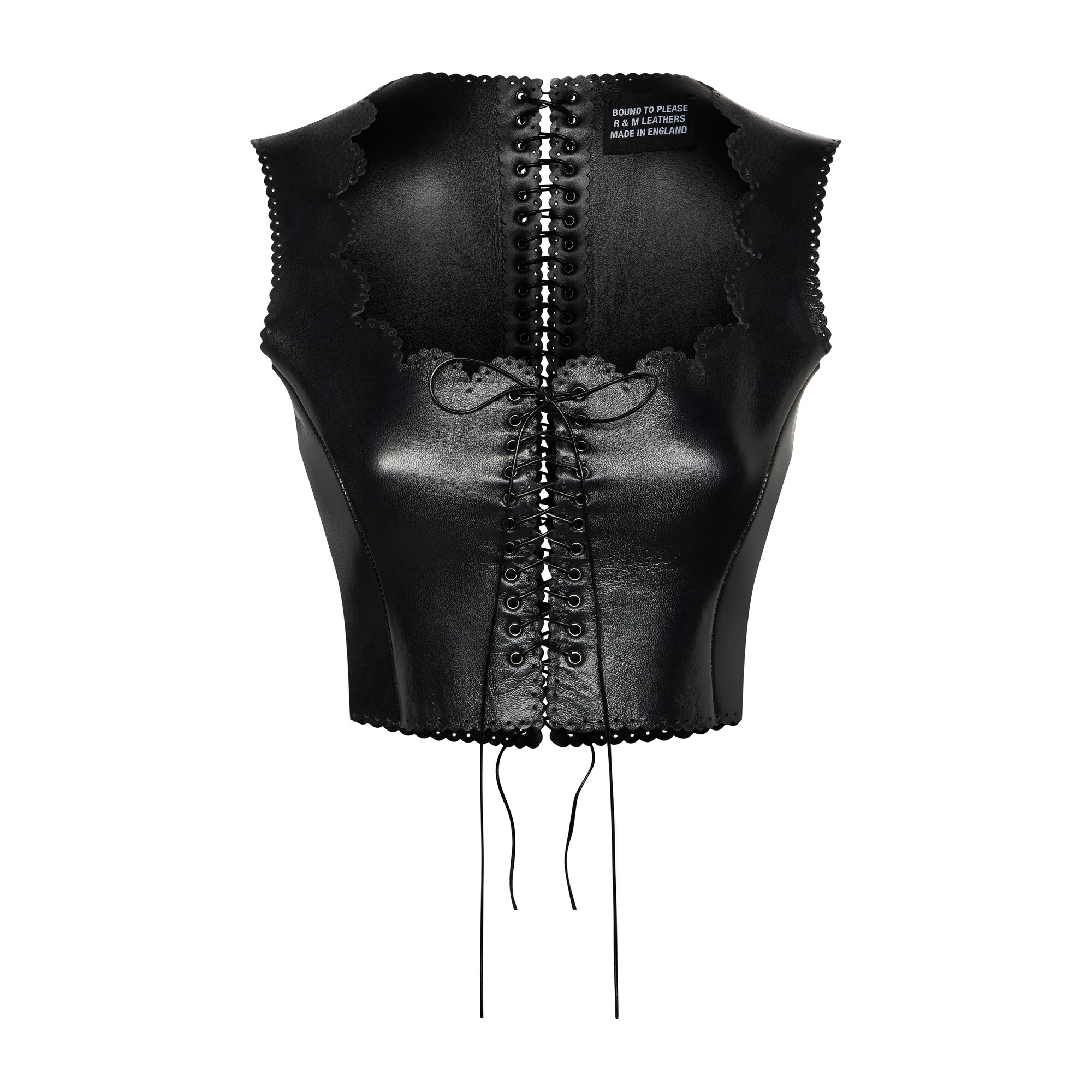 Leather corset top with hand scalloped lace edge. Fully adjustable with an eyelet