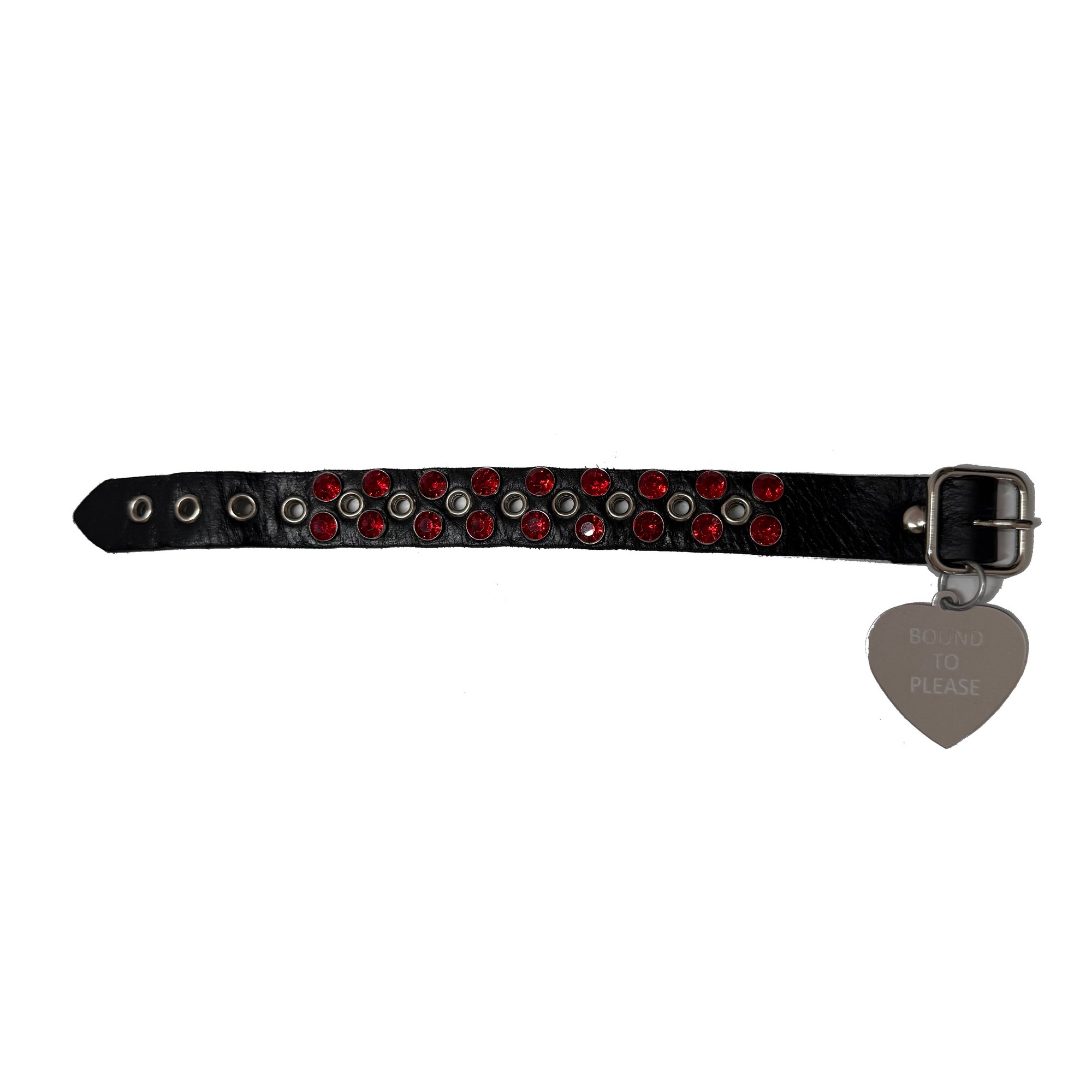 Leather cuff with red crystal detail and BOUND TO PLEASE heart charm.