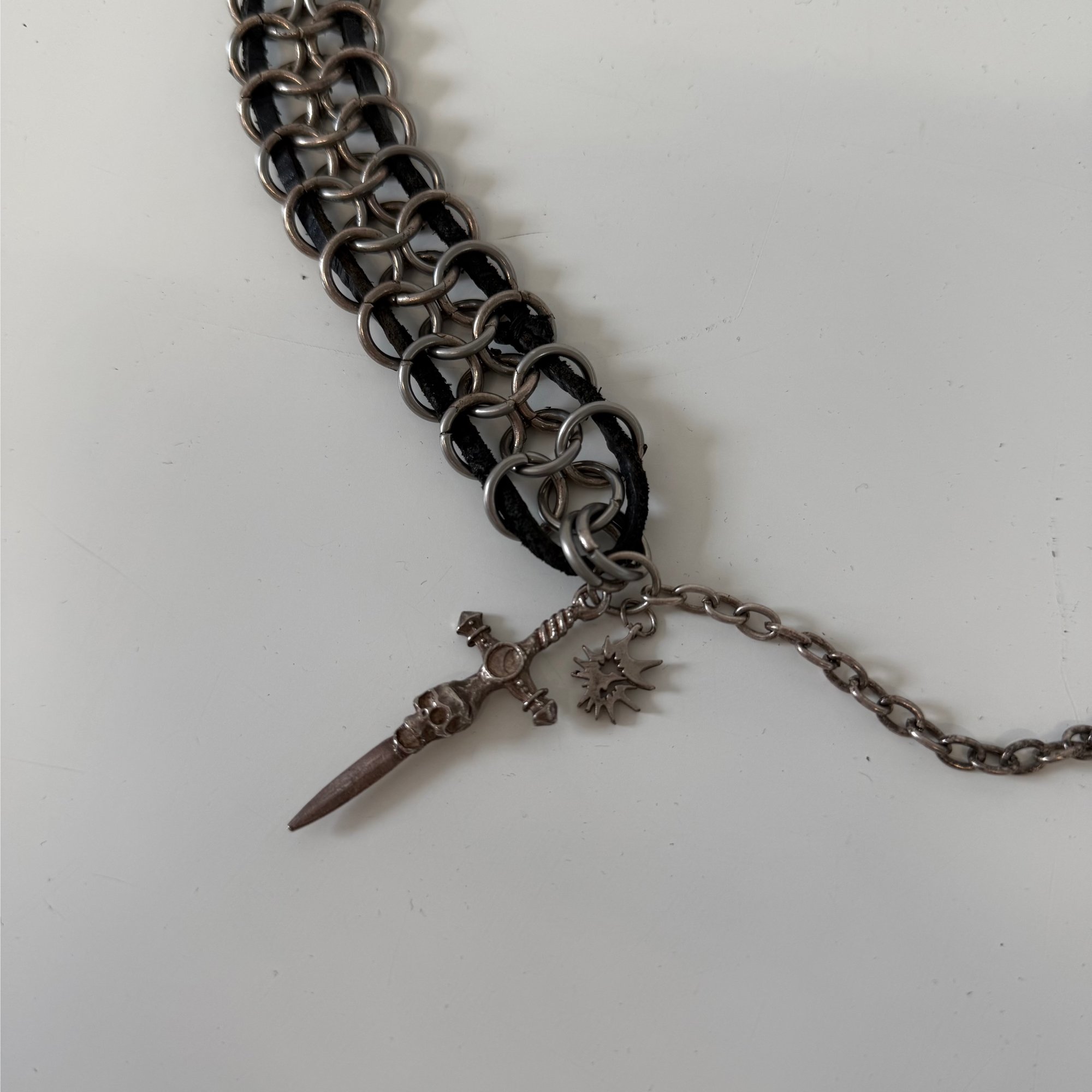 Leather cord and metal ring choker. Sold as seen