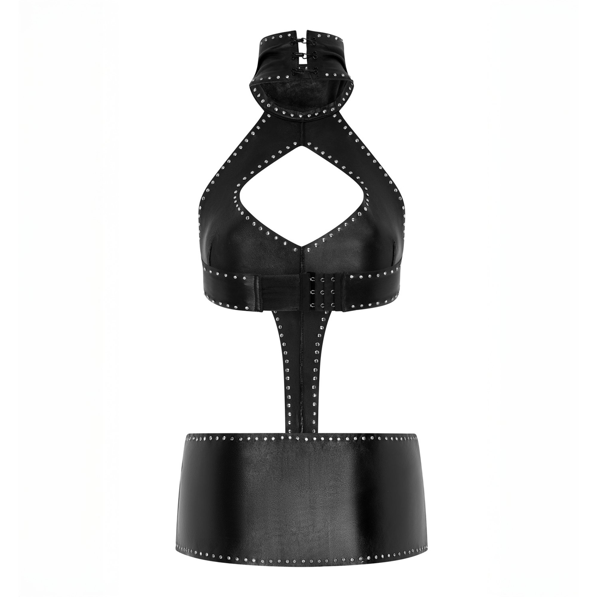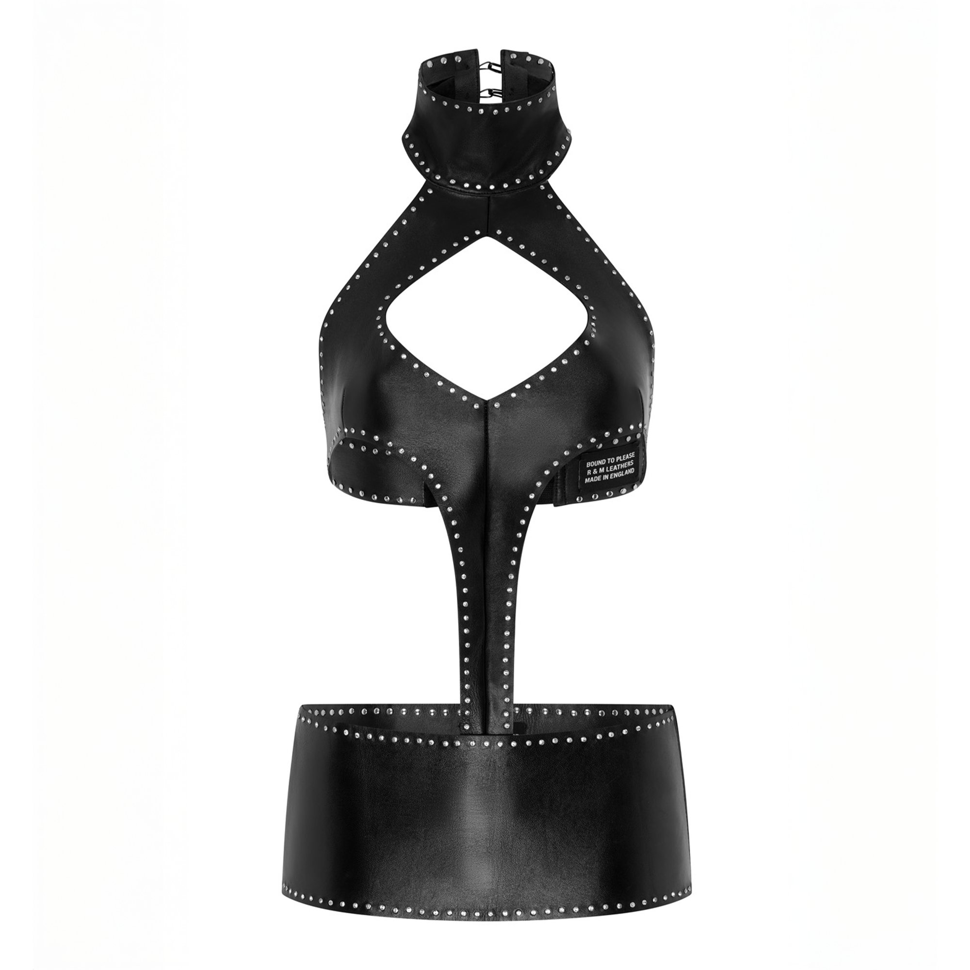Soft leather two-piece with crystal stud trim. High neck bodysuit with a key-hole bust and hook and eye fasting at the neck. G-string bottom with a detachable super mini skirt (14.5CM long, please let us know if you require it to be longer).